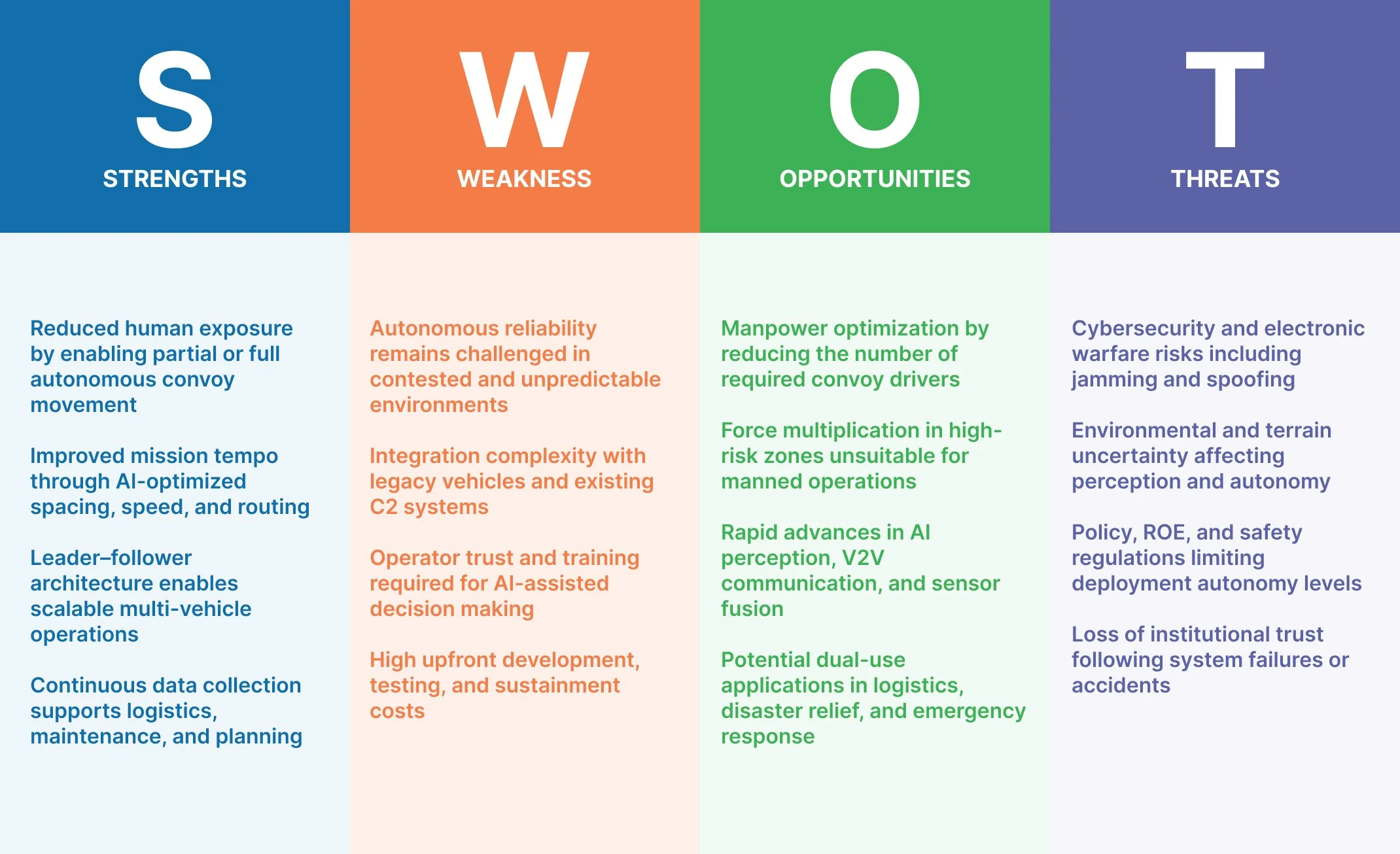 Increasing mission tempo, manpower constraints, and rising operational threats highlight the need for safer, more efficient mobility solutions. Emerging autonomous technologies present a timely opportunity to reduce exposure and improve convoy resilience.