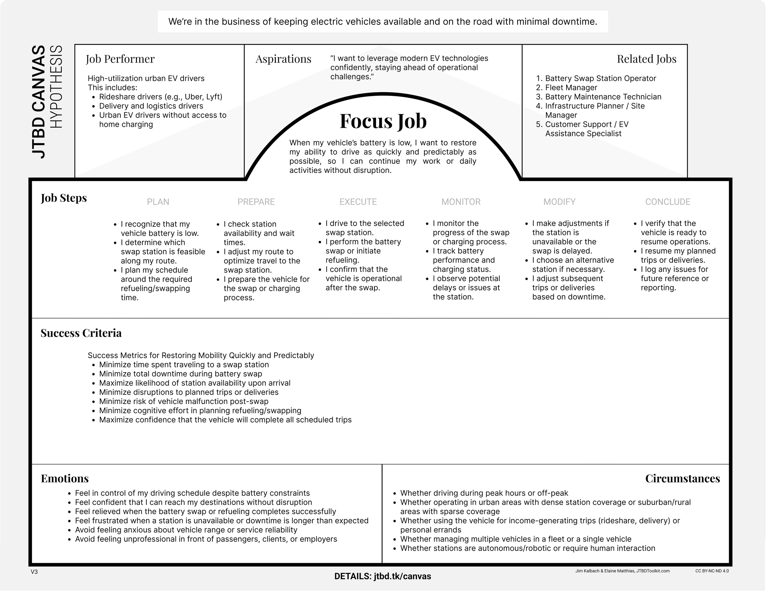 Job Steps: The chronological process of completing the job, structured according to the standard JTBD map (Plan → Prepare → Execute → Monitor → Modify → Conclude).