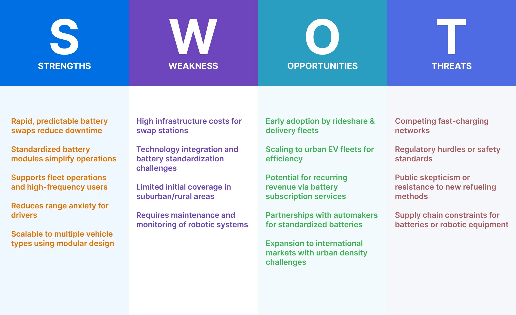 This section evaluates the strategic position of the autonomous EV battery swapping solution.