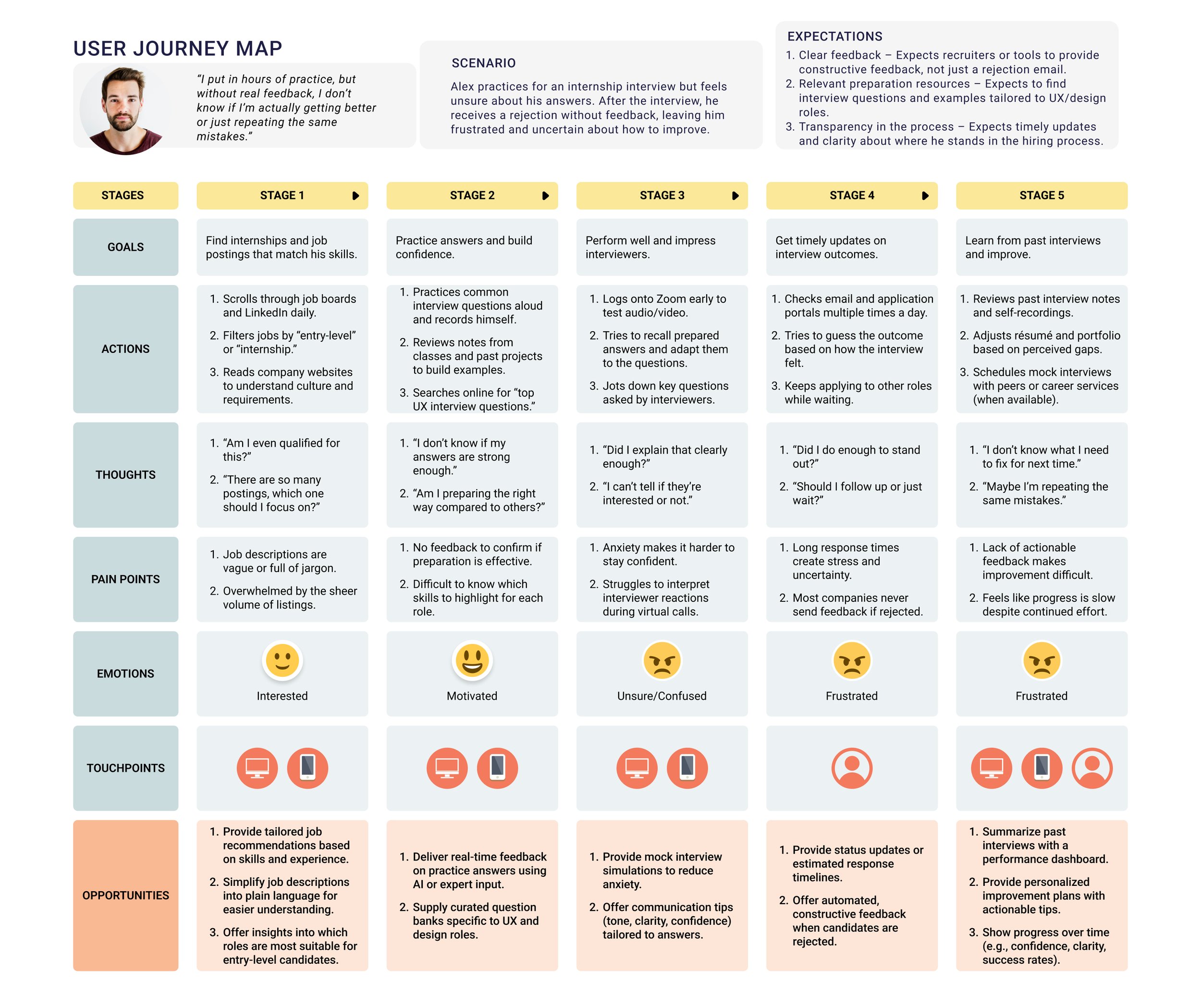 Alex Jones is a 31-year-old master’s student in User Experience Design at the University of Michigan. As he prepares for upcoming internships, he spends hours practicing interview questions, recording himself, and researching common hiring practices. Despite his efforts, he often feels stuck, unsure whether his answers are strong enough or aligned with what employers expect. He’s applied to multiple positions and attended a handful of interviews, but the lack of clear feedback leaves him frustrated and questioning his progress.